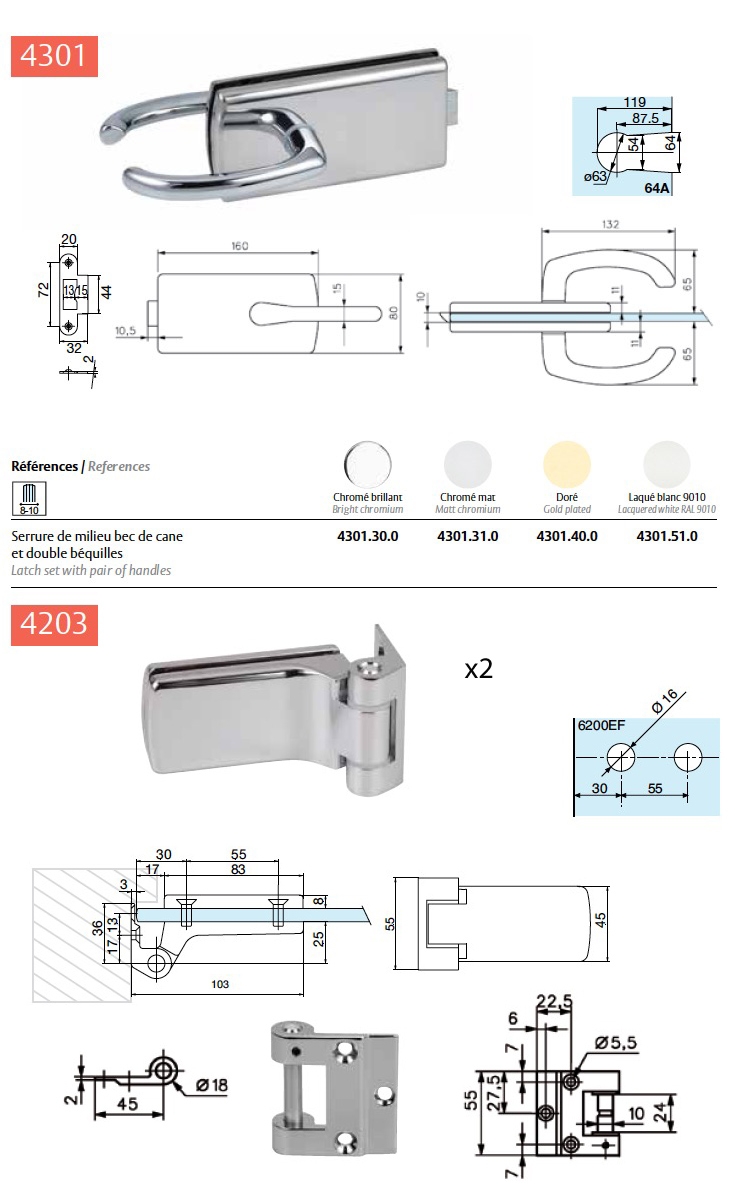 Kit quincaillerie Lagune chromé brillant pour Porte Clarit épaisseur 8mm sécurit , ref 4301.30.0 : sans Serrure, 2 paumelles (ref4200 ou équivalent Longoni), 2 fiches (ref 3206 ou équivalent) en applique. Sur feuillure de 35 à 40mm. Marge autour du verre 3 à 5mm